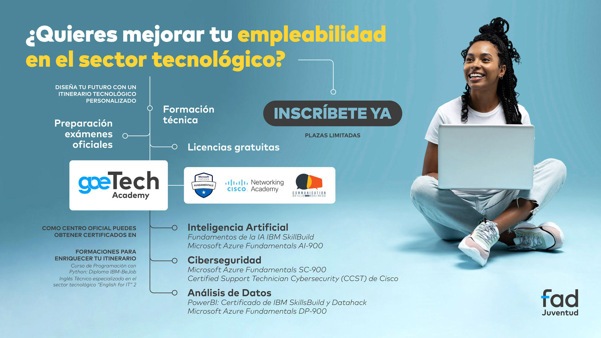 Es muy interesante, ofrece la oportunidad a las personas jóvenes de formarse en áreas con gran demanda laboral y obtener certificaciones oficiales reconocidas internacionalmente, de la mano de entidades como IBM SkillsBuild, Cisco, Microsoft e IT Specialist.