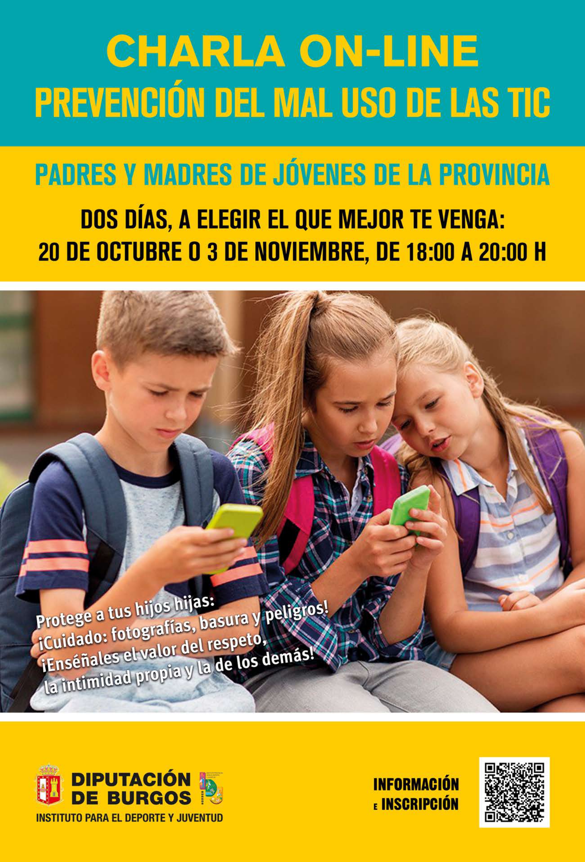 Desde el IDJ de Diputación de Burgos organizamos una sesión online sobre la prevención del mal uso de las TIC. Son dos talleres gratuítos, que se realizarán los días: